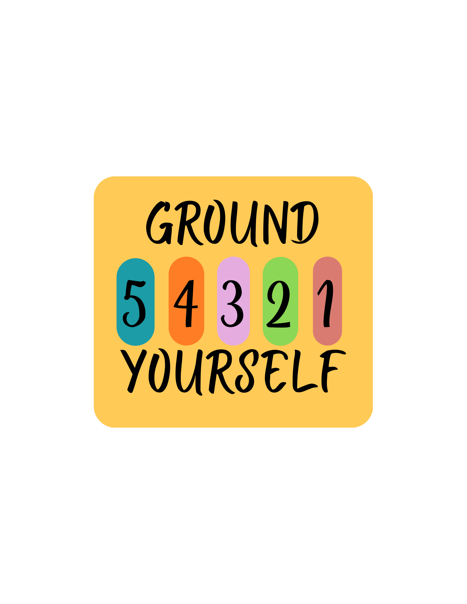 This sticker is a visual cue for that moment. Bright yellow with color-coded numbered pills, it's the kind of bold, readable design that catches your eye on a water bottle or notebook exactly when you need it. Inspired by the Mindfulness Grounding wallet card — same framework, something they can see every day.