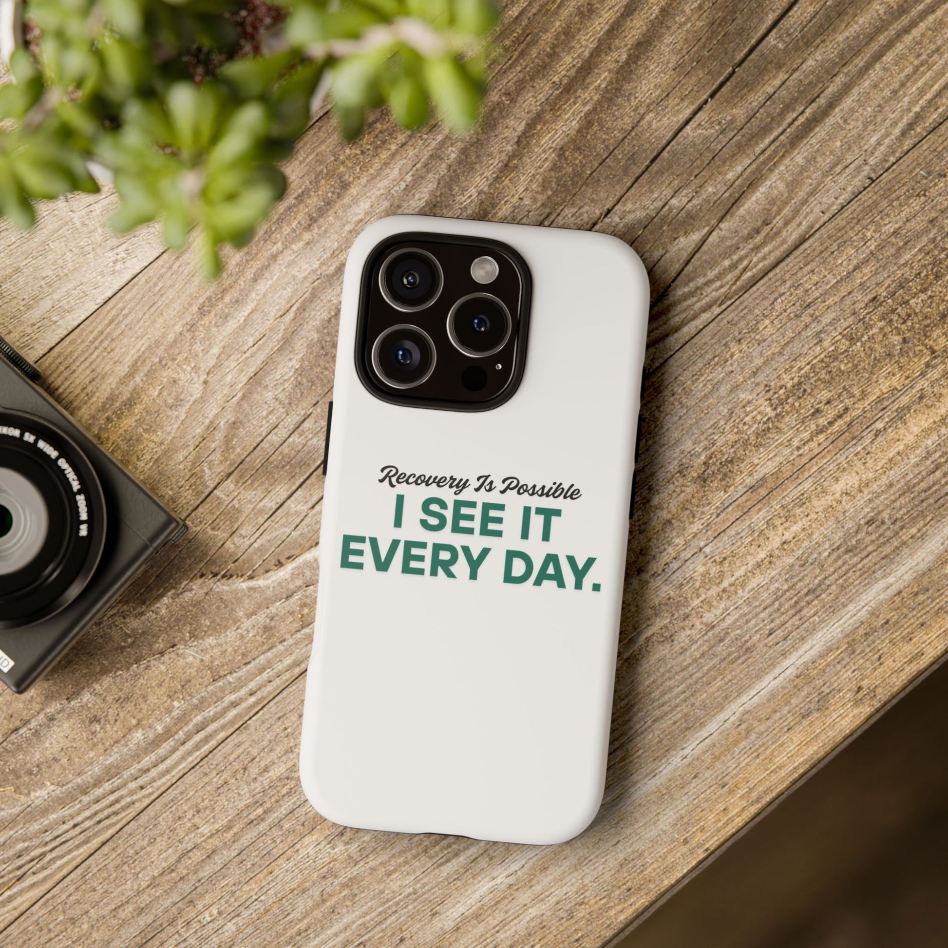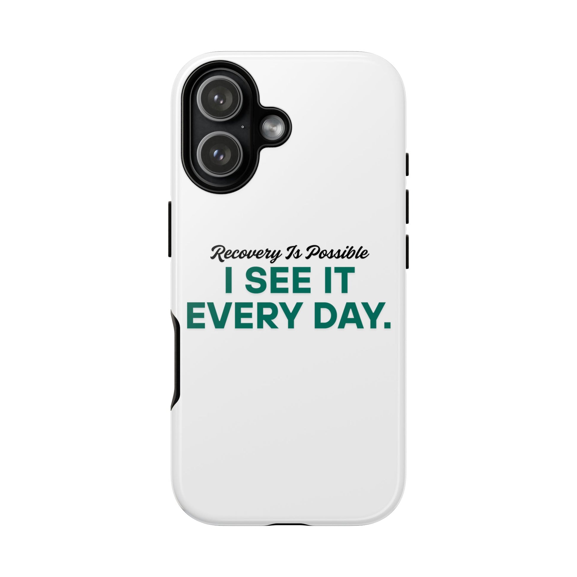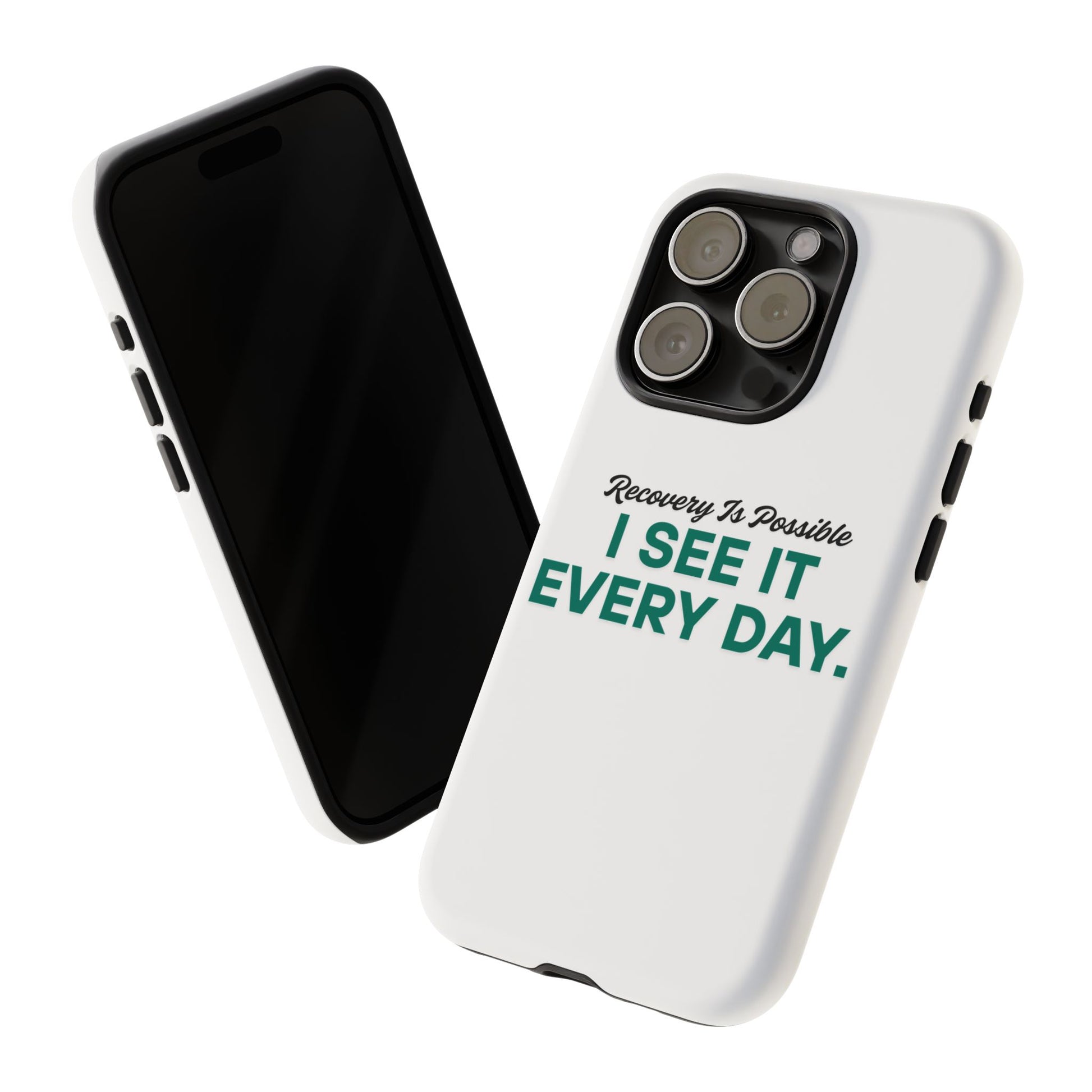 Carry the reminder with you. This durable tough case features our "Recovery Is Possible — I See It Every Day" message in a clean, professional design. Subtle enough for sessions, meaningful enough for you. Available in glossy or matte finish for 50+ phone models.
