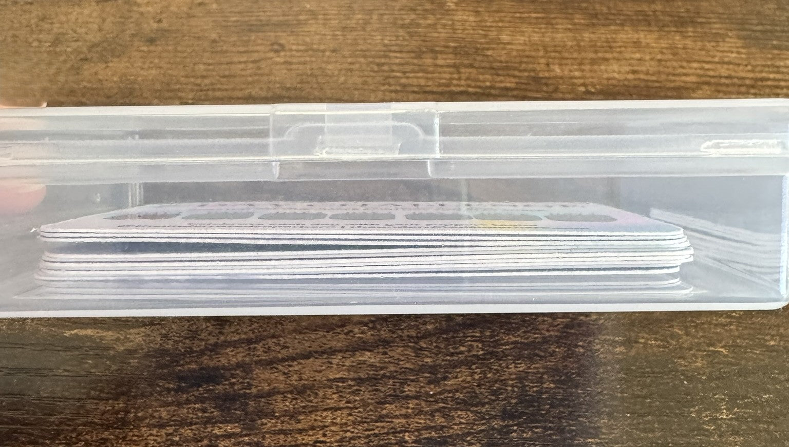 Clear plastic storage case designed for business card-sized items. Interior dimensions (3.6" × 2.9" × 0.8") perfectly fit your 7-Day Challenge Cards. Hinged lid with snap closure keeps cards organized, protected, and ready to distribute. Holds up to 25-30 cards comfortably.